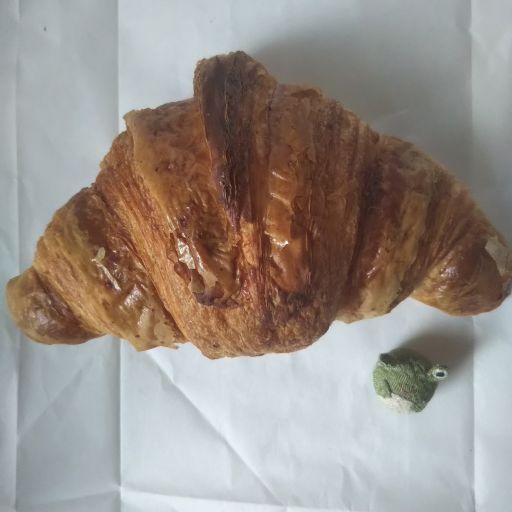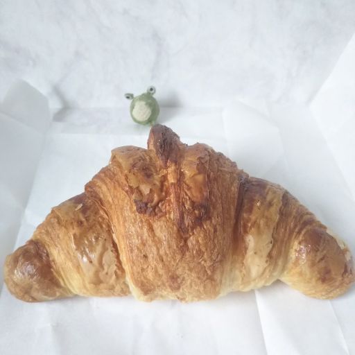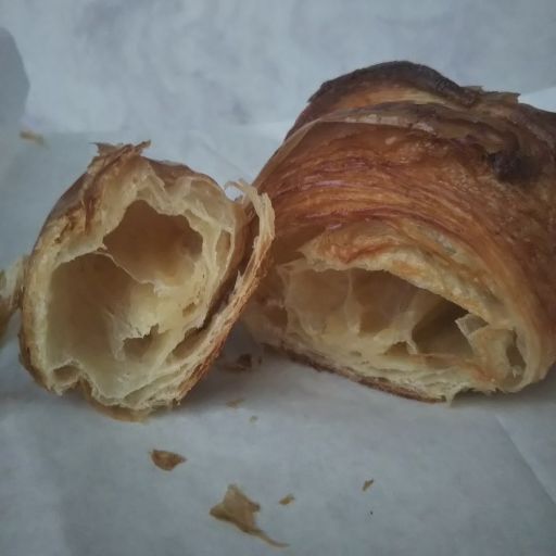 リベイクするとカリカリパリパリが復活しバターたっぷり、いい香り。気泡が大きく、層は少なめのクロワッサン。層は薄く、一層ずつしっとりしているのに、全体としてはサクサク。薄っすらと甘い。これはいくらでも食べられちゃう。おいしかったです、ごちそうさまでしたー。