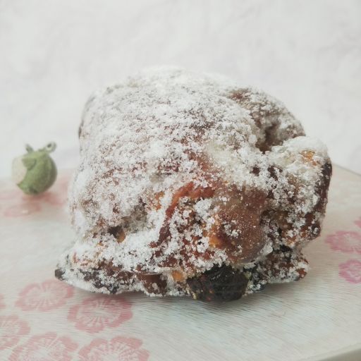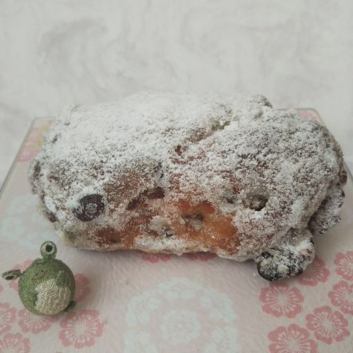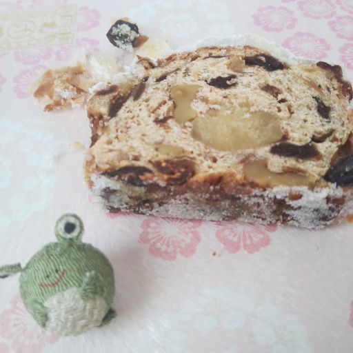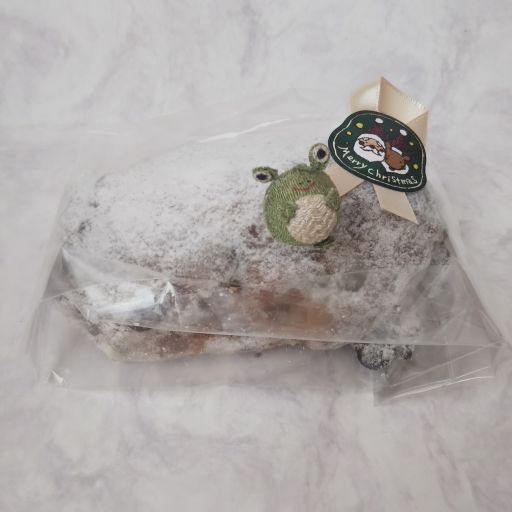 フルーツやナッツがぎっしり詰まっているので、表面までゴツゴツしたパンにグラニュー糖がまぶされている。昔からのイメージ通りのシュトーレンの姿。最近のはお菓子寄りのものが多いけれど、こちらはしっかりとパン。レーズンやいちじく、くるみ、アーモンド、チェリー、オレンジピールなどが入っている真ん中にマジパン。パサつきがちなパンをいい感じでしっとりさせてくれる。このマジパン、よい香りがするの。なんだろう?ねっとり感はそれほどでもない。普段あまりマジパンに興味がわかないのだけれど、これは美味しい!周りのバターと砂糖のコーティングは、今まで食べたものとは違って、バターより砂糖が多い感じ。氷砂糖とまでは言わないけれど、ガリガリッとする。マジパンが印象的で、美味しかったです、ごちそうさまでしたー。