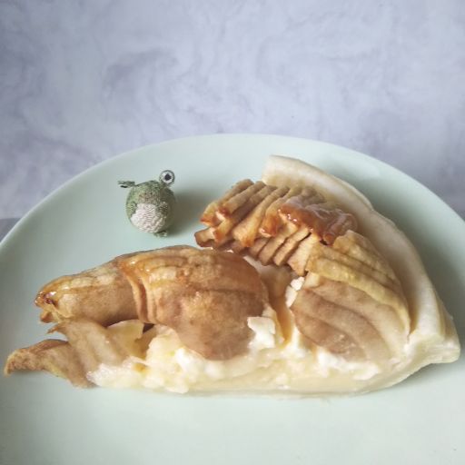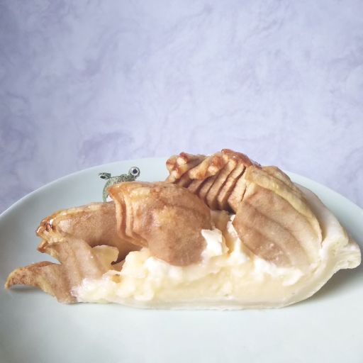白いパイ皮の上にカスタードクリーム、その上にクリームチーズ、そしてリンゴスライスという構造。