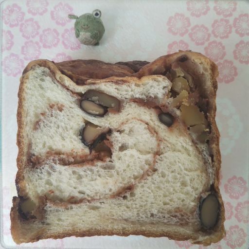 黒豆かのこと栗の甘露煮を巻き込んだ食パン。マーブル状をつくるのはマロンピューレかな。