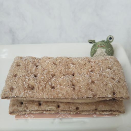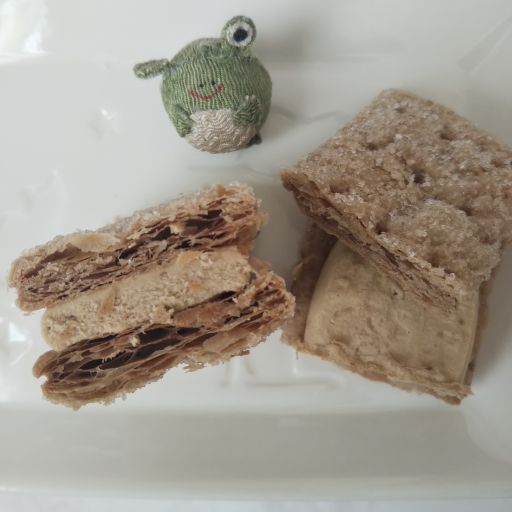 サクサクのチョコレートパイになめらかなクリームが挟んである。モカホワイトチョコクリームはふんわりと軽く、やわらかな甘さ。モカがいい。グラニュー糖がぱらぱらとかかったパイはきちんと層になっていて、サクサクと軽い。寒い朝、霜柱を見つけては踏んだことを思いだす。軽い食感が素晴らしいパイのお菓子。おいしかったです、ごちそうさまでしたー。