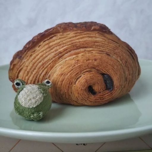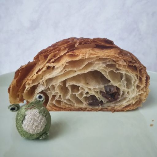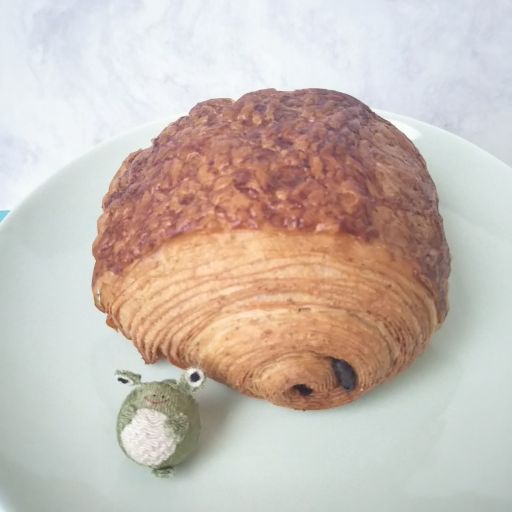 パリパリのサクサクで層がハラハラと落ちていく。ビスケットと同じ材料を使用しているそう。北海道産はるゆたかと国産有機全粒粉をブレンド。北海道産バターがじゅわっときて、パンがとても美味しい。そこにフランス産バトンショコラが2本。そこまでダークチョコではなく酸味と甘さがほどよくてこれまた美味しいチョコ。ちょっと塩気もあるかな。サクサクの印象が強いパン・オ・ショコラ。おいしかったです、ごちそうさまでしたー。