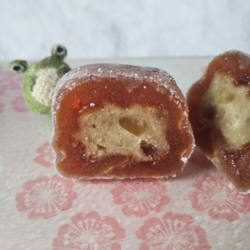 干し柿のねっとりもっちりとした甘さの中に、栗きんとん餡が詰まっている。信州産の栗と国産手亡豆で炊き上げている。濃厚な甘さの中、爽やかさも感じるのはなぜだろうと思ったら柚子だった。